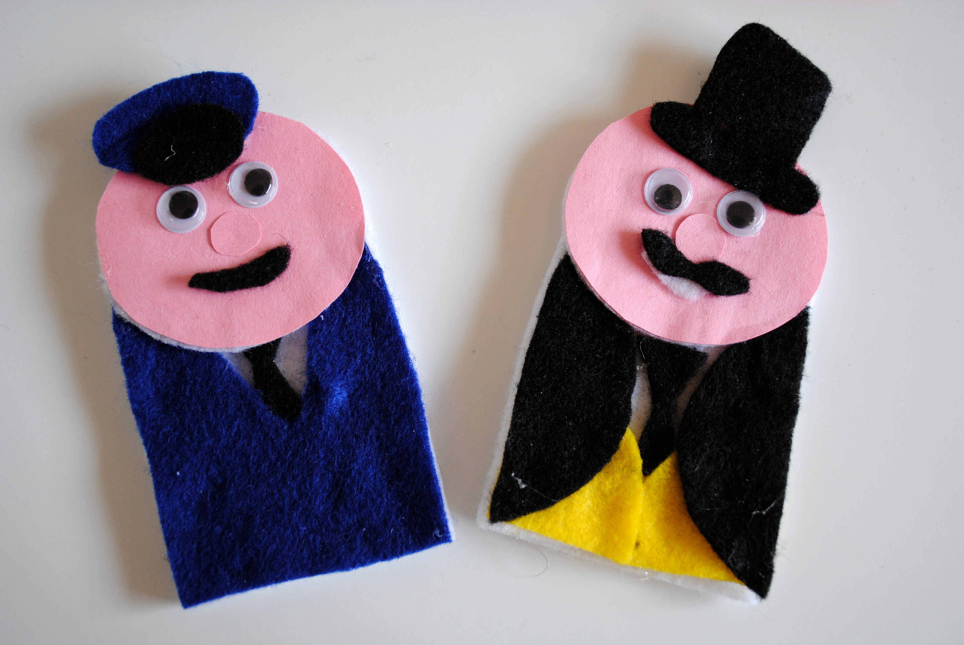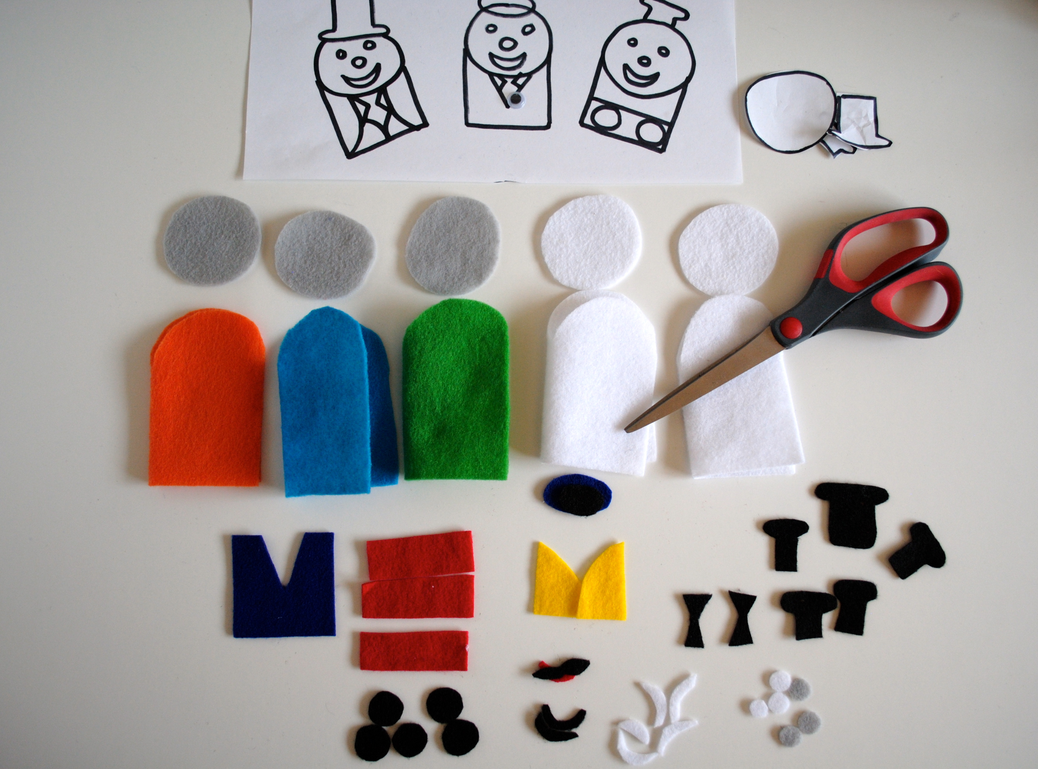 8. Gather all your cut-outs. I recommend using pale pink for the face. I didn’t have pale pink felt so I used pink construction paper over the white face. Glue the body leaving space for your child’s finger. I recommend placing the sweater, tie, and head on, but not gluing it until you have it set. Otherwise you’ll glue the sweater down and the tie needs to go underneath it. Mr Conductor —