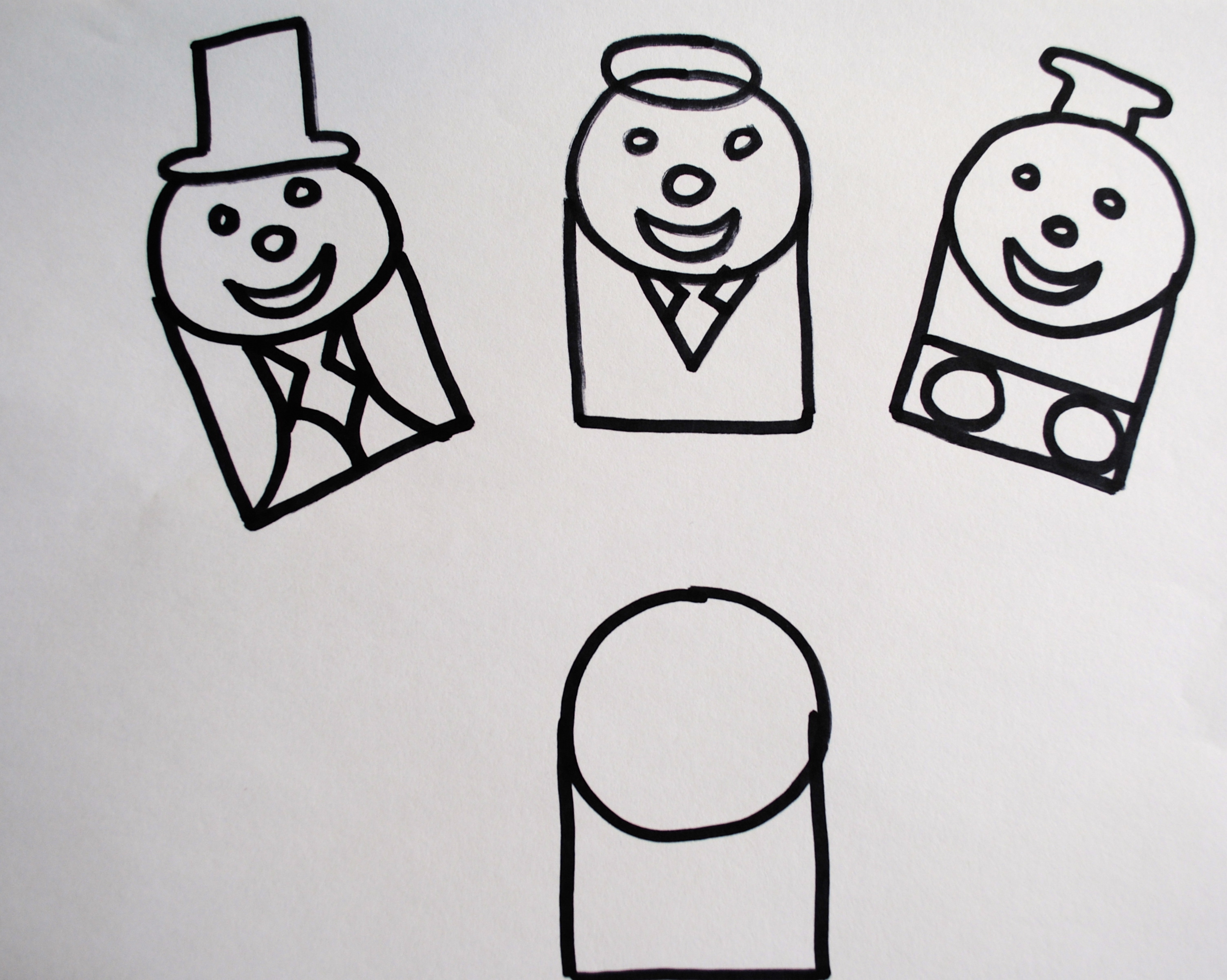 1. On a piece of white paper draw outlines of your favorite characters. You’re welcome to use the ones I drew, just double-click the image, drag to your desktop, and print. Or you’re welcome to draw them too.