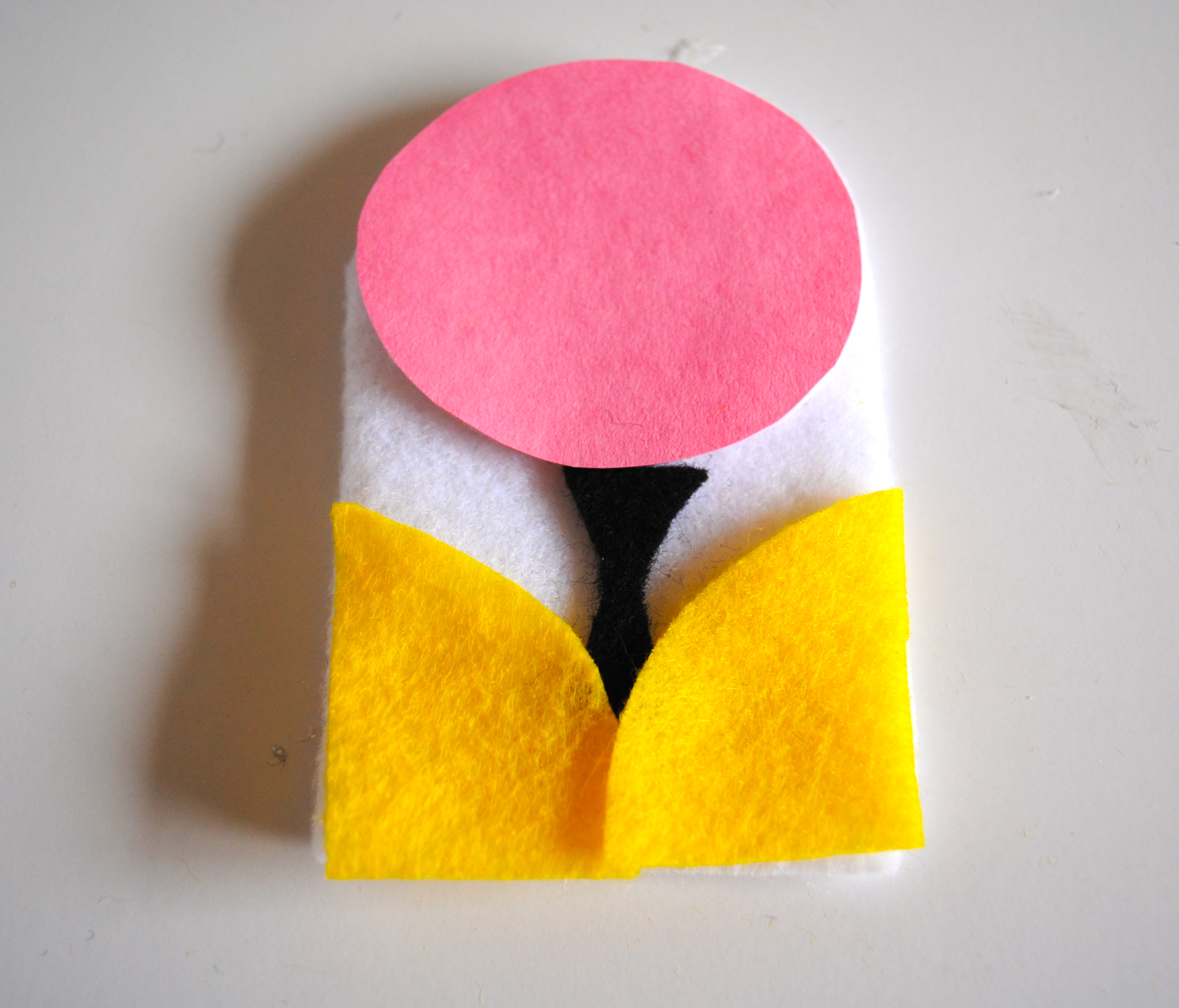 2. Cut out the base. Fold the felt in half, place the base on top and cut. Use this to cut all your characters first in different colors. Note: I kept the left side flush to the edge of the felt to cut-out having to glue that side, not necessary, but helpful.