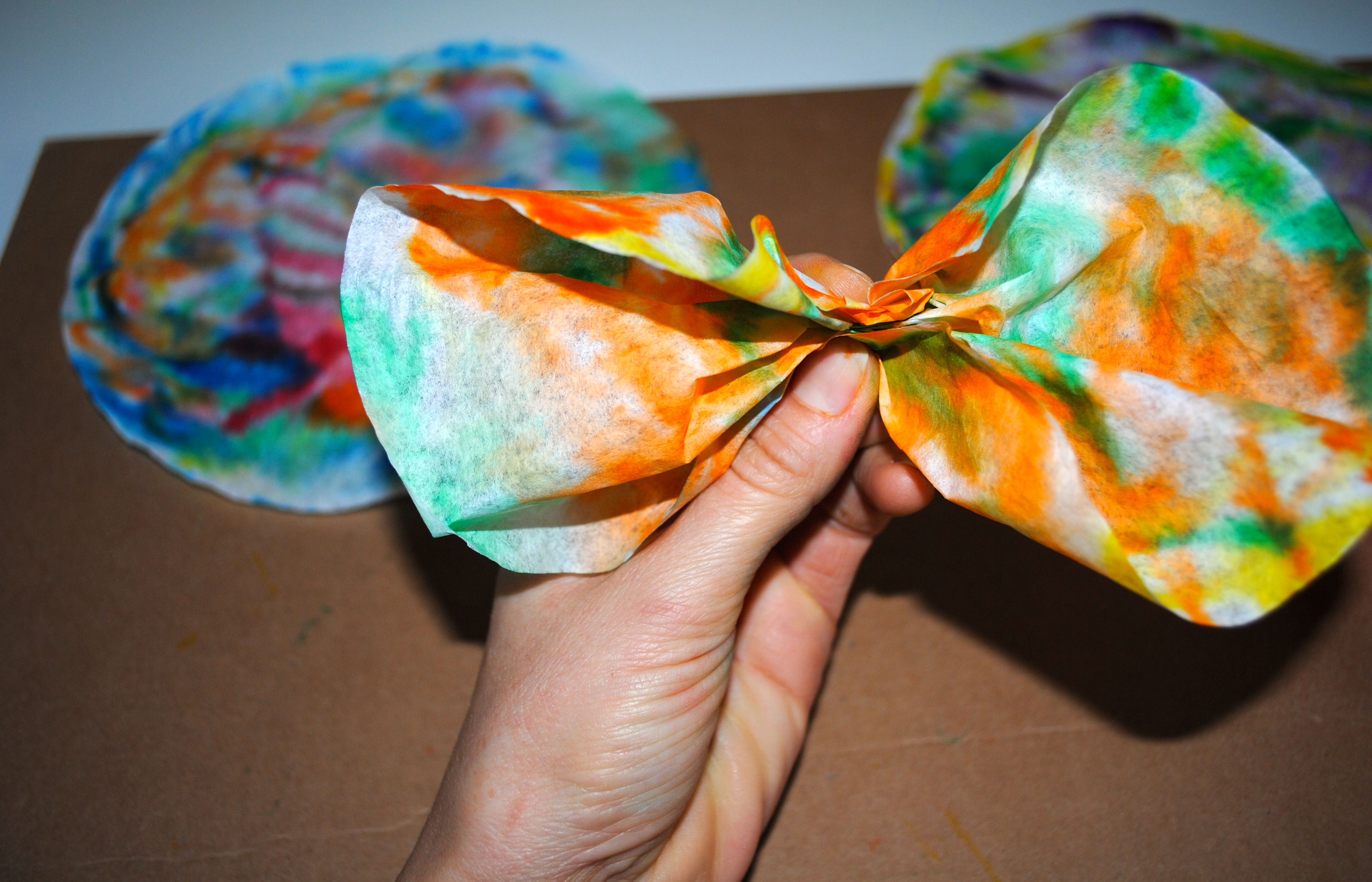 4. Once dry, pinch tie-dyed filter in the center from top to bottom.