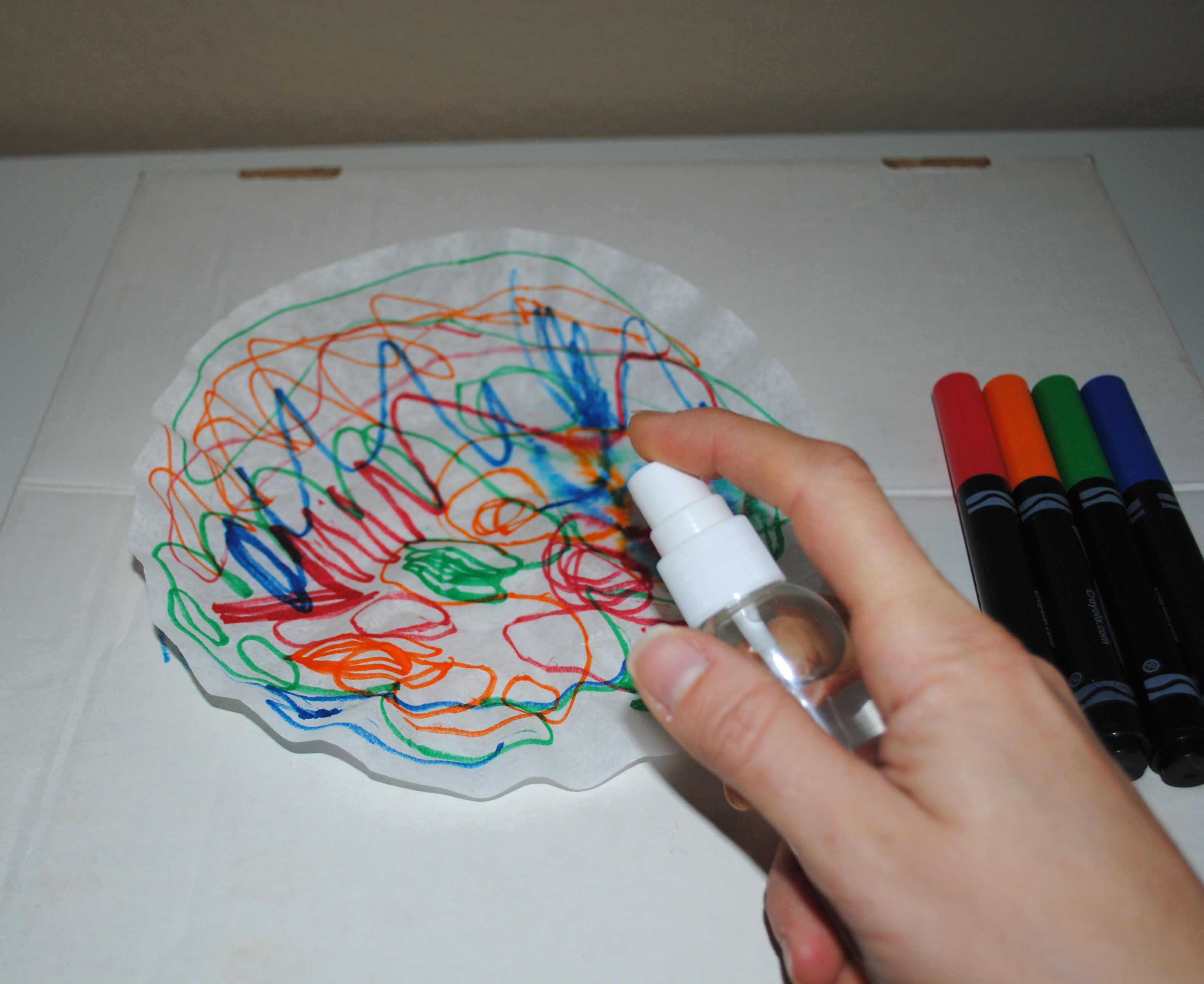 3. Next, wet the coffee filter using a spray bottle and let it dry on a piece of paper towel. Watch what happens when you spray, colors will change and move.