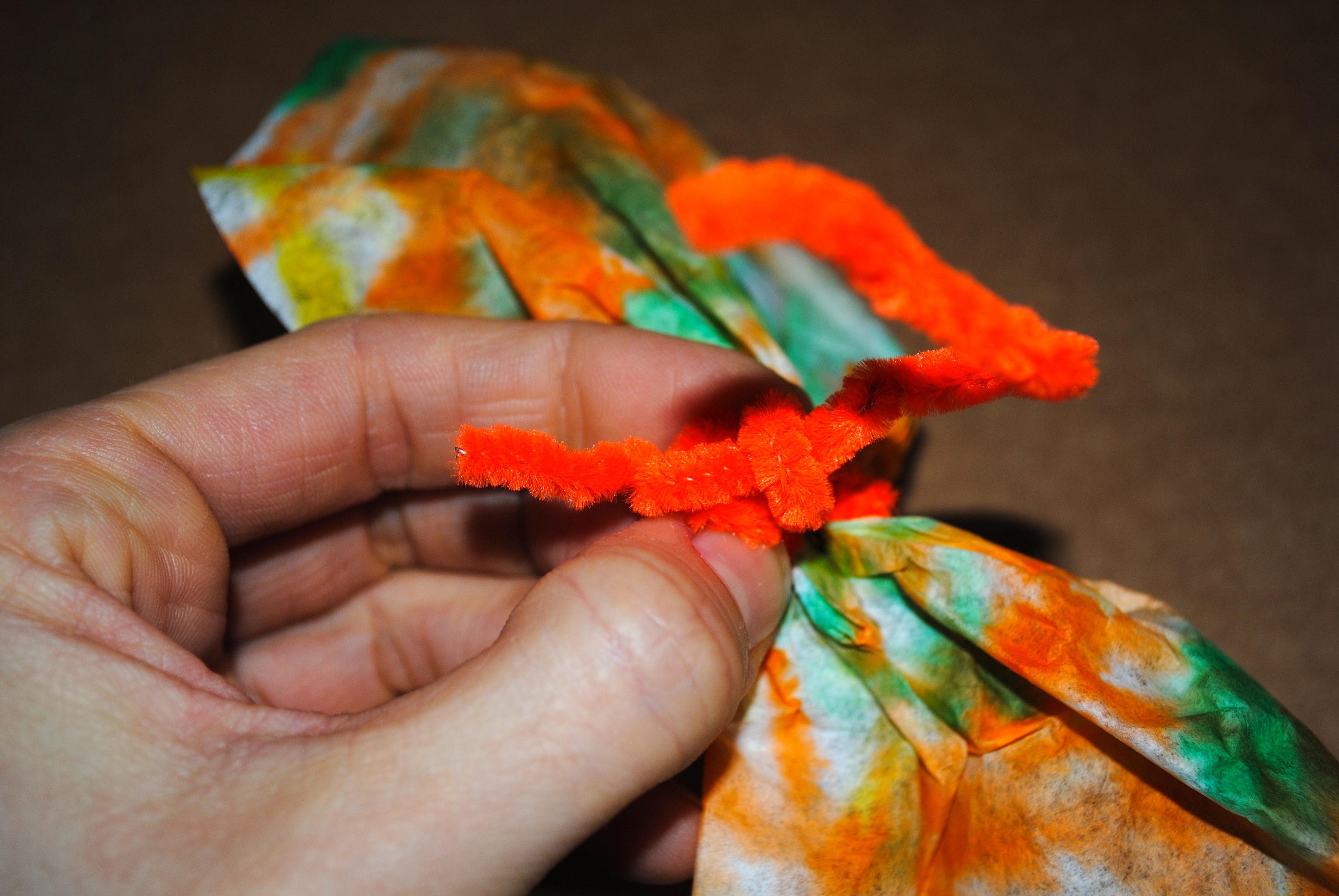 5. Help your child cut a pipe cleaner in half, then starting at the end of the pipe cleaner, wrap it around the center of the scrunched filter, securing it tightly by twisting. Continue to twist, leaving some length to create the curly body.