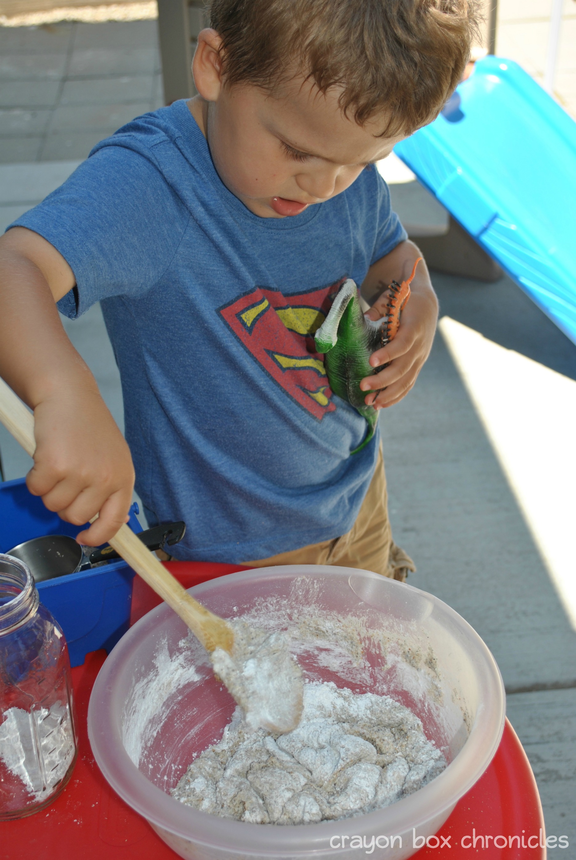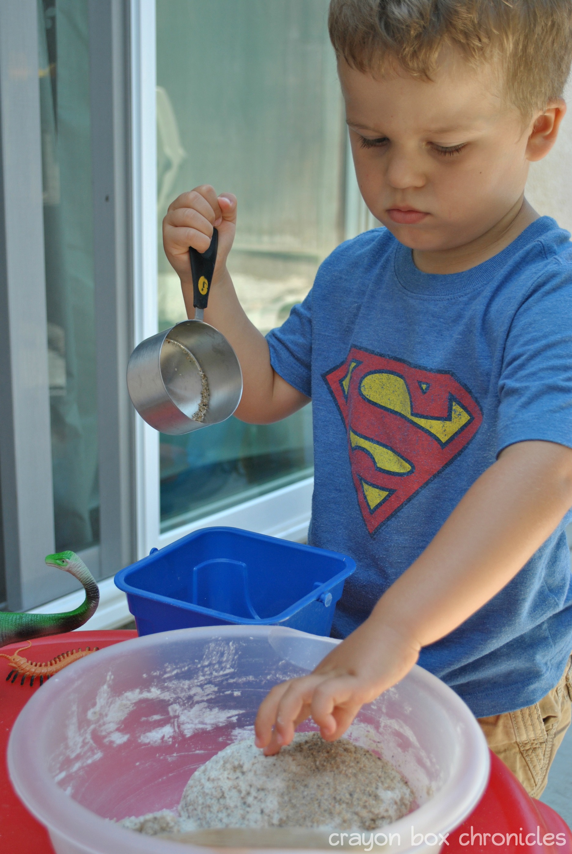1. Pour 2 cups flour and 2 cups sand into bowl. Add warm water and oil. After mixing, it was to tacky, so we gradually added another 1/2 cup to achieve desired consistency {total 2-1/2 cups}. I really wanted a sandy texture for sensory play, so we added 3 cups total, plus more on the table during play. It helps to bind it together. Here’s my little scientist working up the sand dough …