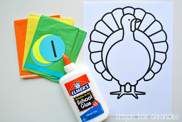 Gather all our supplies – not much right?! Simply print out your turkey template (materials section), assign your color order – great for the kiddos to do, and spread them out. Before we could even decide our color order, C immediately starting naming the colors and numbers. “I want red as the number one Mommy,” replied C! “Red, yellow, orange, green, ow and wait – brown bag!” I didn’t have brown tissue paper on-hand, so I improvised with a paper bag!