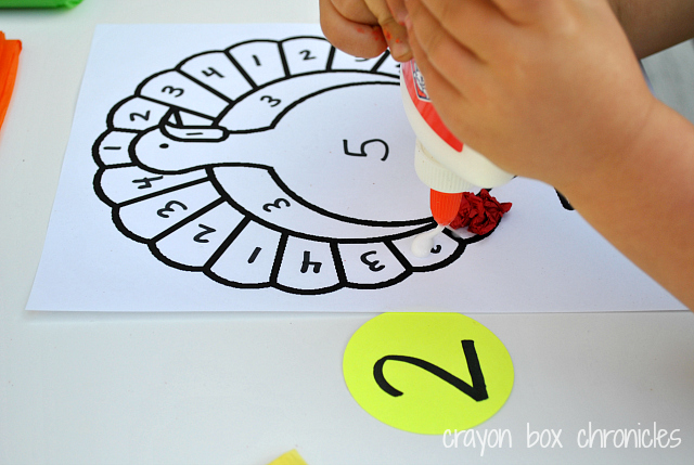 Once he decided on colors and numbers, I numbered the turkey – with his help of course! Next, he ripped the paper into small strips.