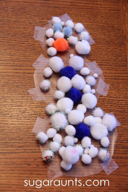 I stuck the contact paper to the table with little bits of tape. You might want to tape your contact paper to a sheet of paper instead. This technique worked much better! It was fun to build our snowman with crafting pom poms and add little details like sparkly poms. Baby Girl (age 2) thought we needed a penguin sticker, too.