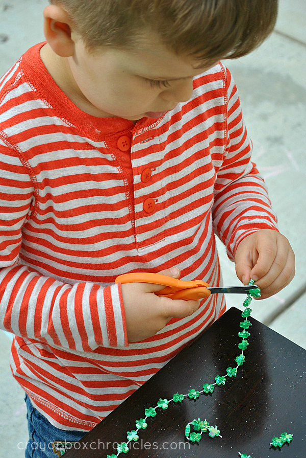 I knew he really enjoyed cutting beads from our heart sensory collage activity, so it was no surprise that he immediately grabbed the shamrock necklace and began cutting. “I’m cutting Mommy! “I’m cutting my necklace!” he yelled. It holds his attention and helps develop his much-needed cutting skills for preschool.
