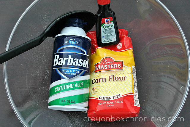 Add a full bag of corn starch or corn flour and 3/4 can of shaving cream. Foam dough tends to dry-out quickly, so we reserved a little. Next, add your food coloring, 10-15 drops.