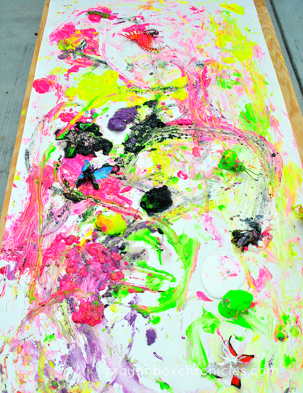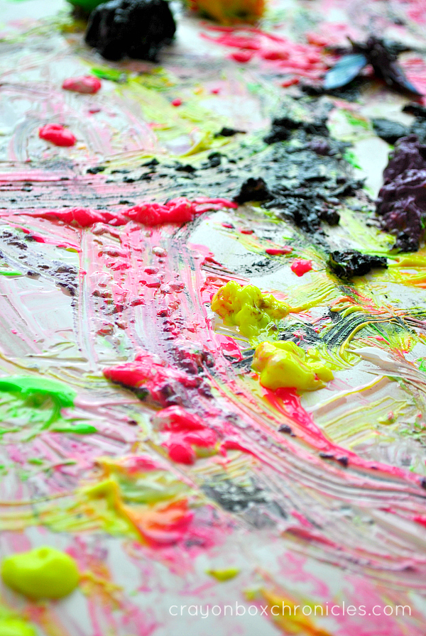 The colors are so vibrant and pretty! C chose bright spring colors, aside from black, for his open-ended art activity. Once the frozen insect cubes melted, they formed large gobs of gooey paint.