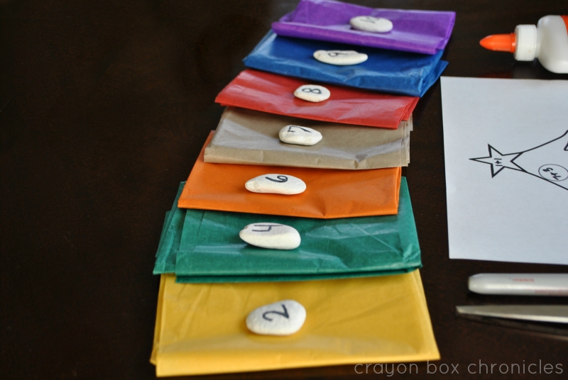 Once you’ve decided on colors and addition problems, rip or cut the paper into small squares.