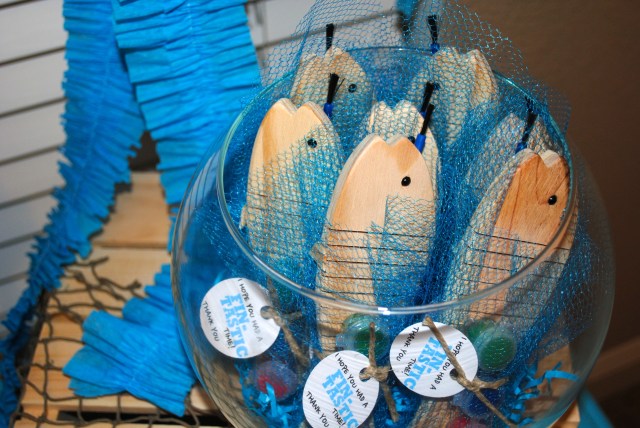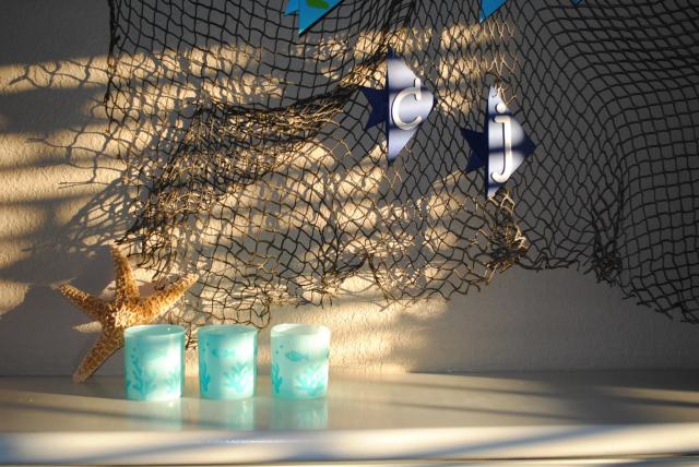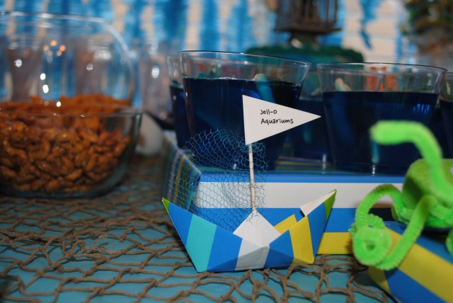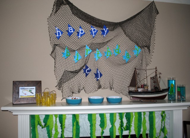 Fishing nets have so many uses! I used a basic origami fish fold with heavy card stock and glued on large chip board letters {Hobby Lobby, 5.99} — “Happy Birthday CJ!” Luckily, the net, boat, shells, and stones I had from him baby room — we did an ocean theme {big surprise}.