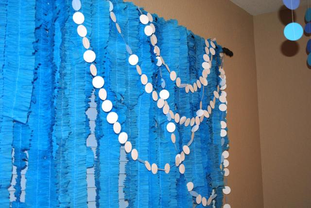 The long bubble chandeliers projected the feeling of being underwater and the ruffled streamers represented waves. I used for the backdrop and the dessert/favor table.