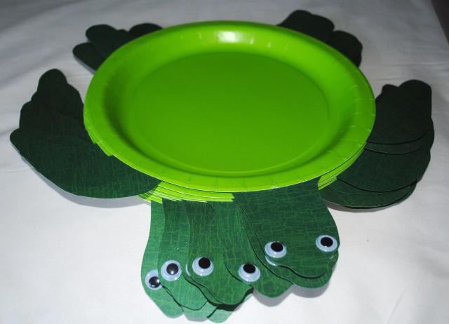 - {DIY} Turtle Plates: green plates, turtle leg template, glue. Traced the turtle legs on scale-like paper, cut them out, flipped the plate over, attached them with hot glue, and added goggly eyes.
