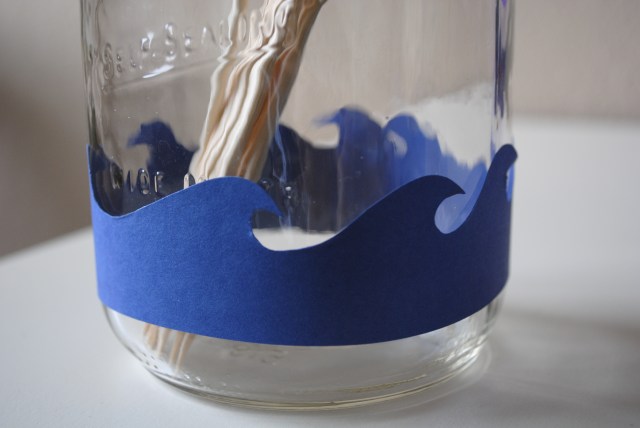Mason jar silverware holder with wave border.