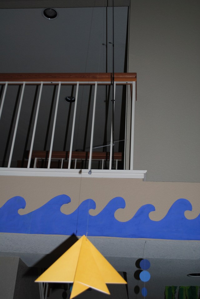 - {DIY} Wave Border: butcher paper painted blue {tempura paint, Michaels, 1.99}. I drew a wave pattern, cut it out, painted it, added chipboard letters.