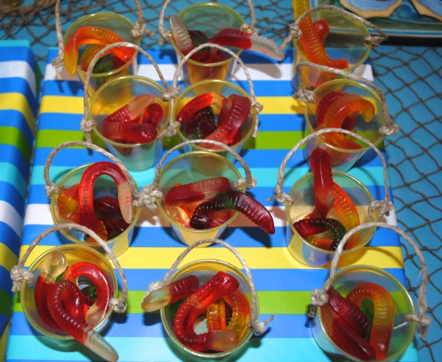 The “buckets” also doubled as my fish bait pails {TUTORIAL} full of yummy worms, gummy style.