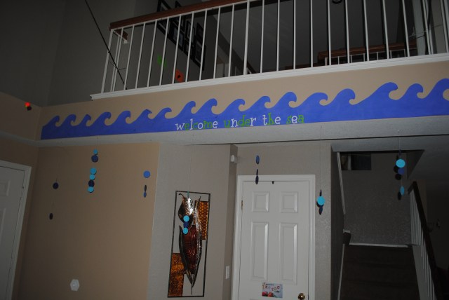 As you enter —wave boarder sign, “Welcome Under The Sea” with bubble drops and fishing poles.