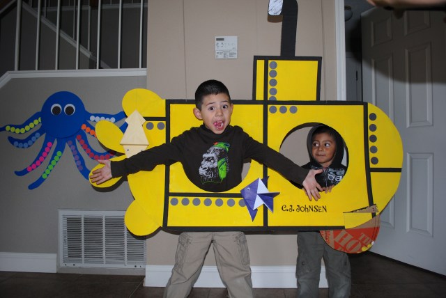 Submarine Photo Opp! C.J reporting for submarine duty! We made a submarine our of cardboard, black paper for the circles, black electrical tape fo the lines, and yellow paint.