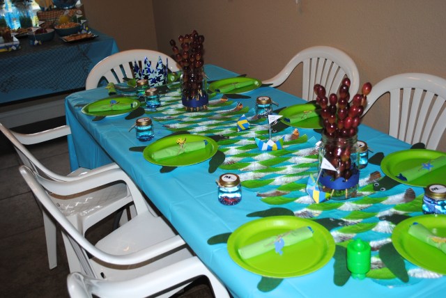 I made different sized origami paper boats {they actually float} and added large paperclips to the top of the boat. By the end of that party it was more like soggy paper boat fishing with an invasion of CJ’s animals and gummy worms!