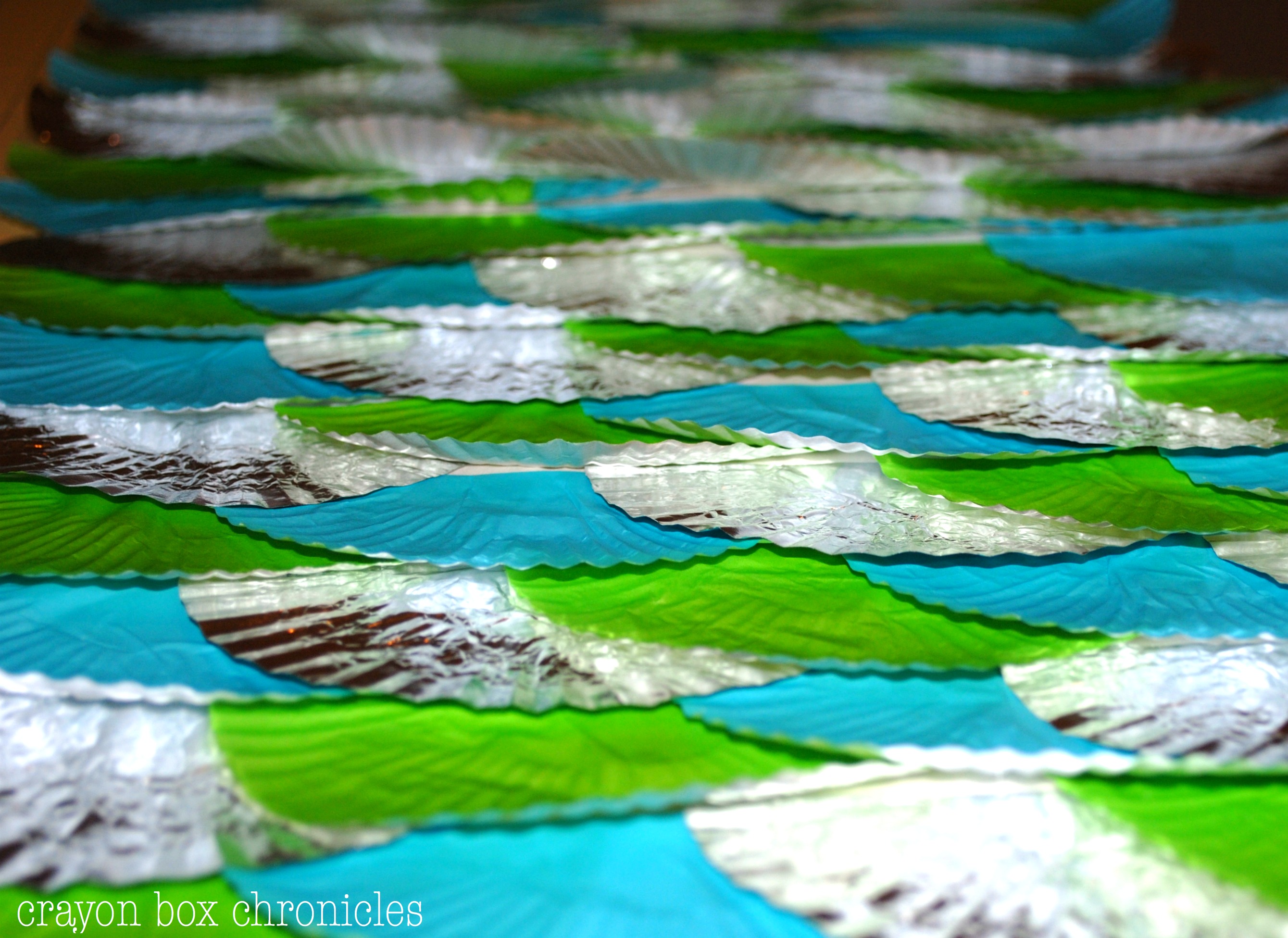 - Start from the bottom up and begin to glue your cups down in row using a pattern, overlapping them slightly {I did foil, green, blue, foil, green blue …}