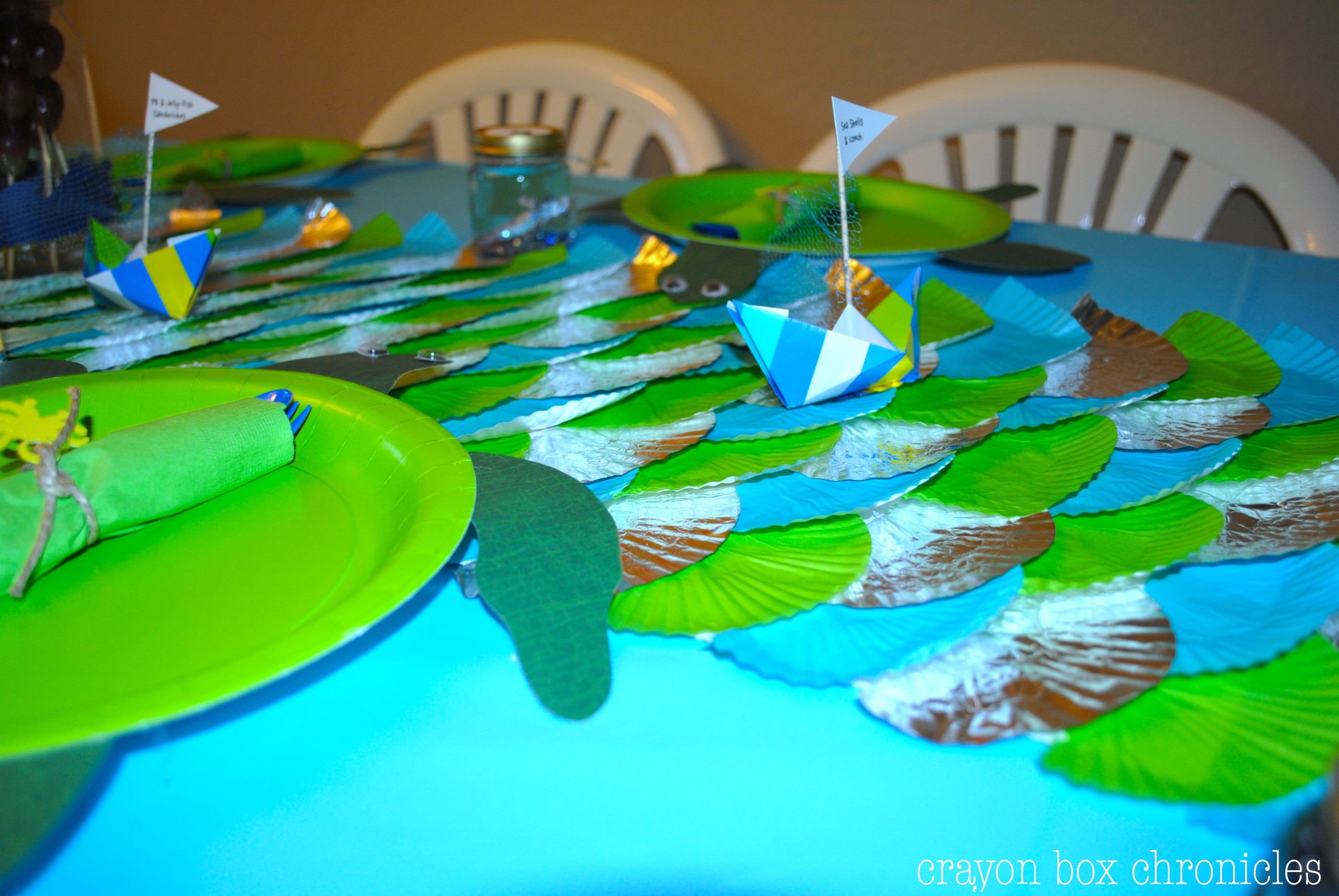 So simple and fun! It really “shinned” like fish scales! It complimented the origami food labels and the aquarium name labels too! Watch out turtles, the boats are coming! Don’t forget your party hats!