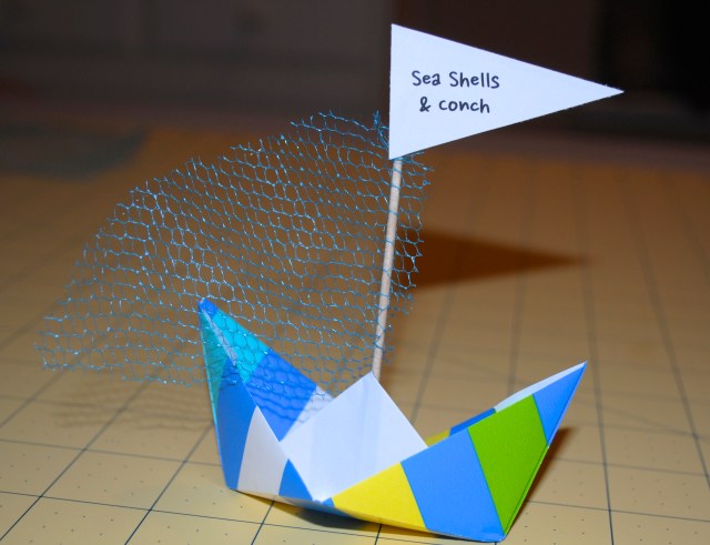 6. Finally, glue the flag pole to the back of the boat tip. I played on ocean words that coordinated with the food—PB & Jelly-Fish Sandwiches, Crunchy Sea Plants, Goldfish Bar, Sea Kelp, Sparkling Octopus Ink, and more.