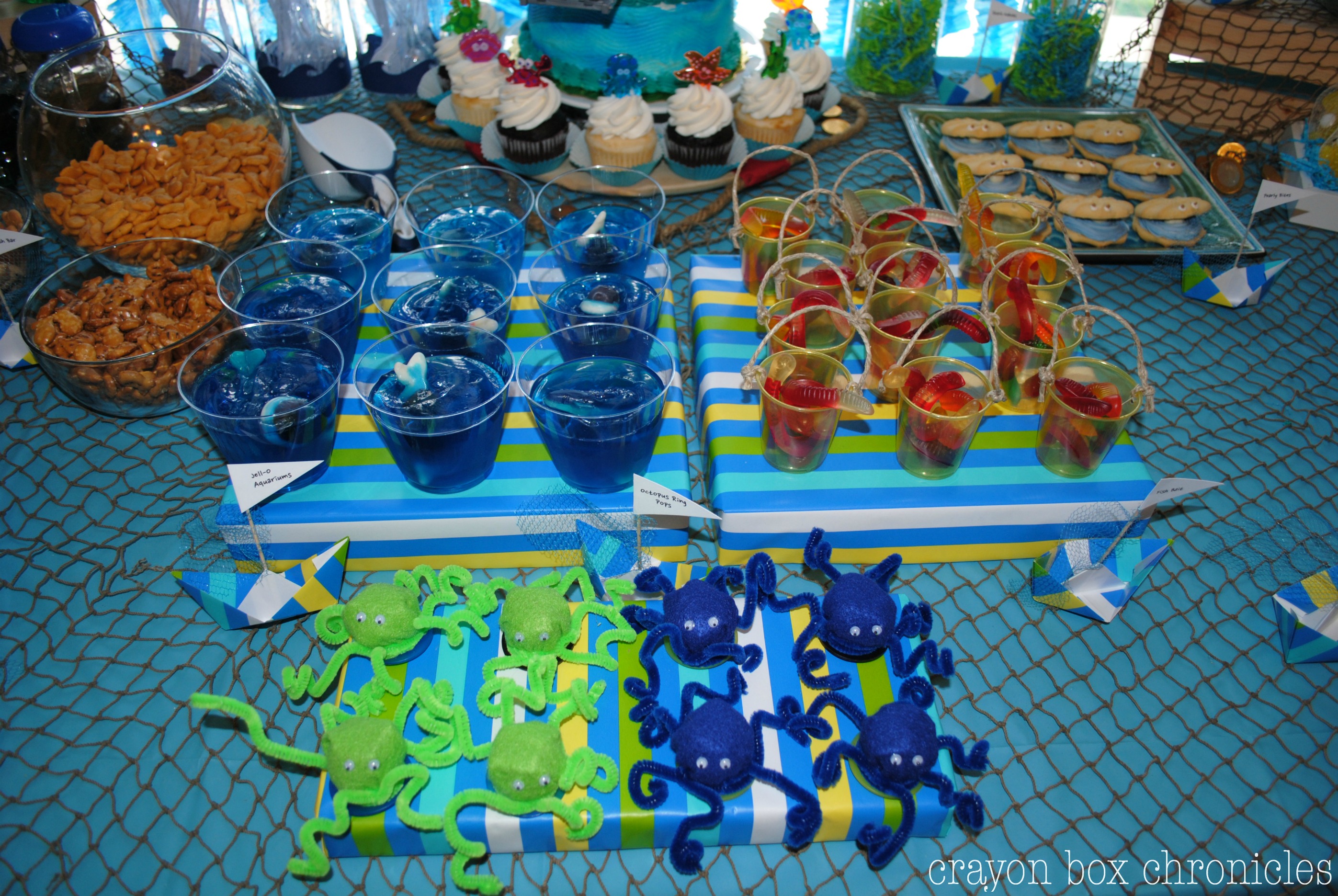 - Finally, dab some hot glue on the felt and add the goggly-eyes. I wrapped Styrofoam {Hobby Lobby, 2.99} with coordinating wrapping paper {Target} and pushed pops down into the foam. To complete the look — Boat Food Labels, Jell-O Aquariums, Fish Bait Pails, Pearly Bite Cookies.