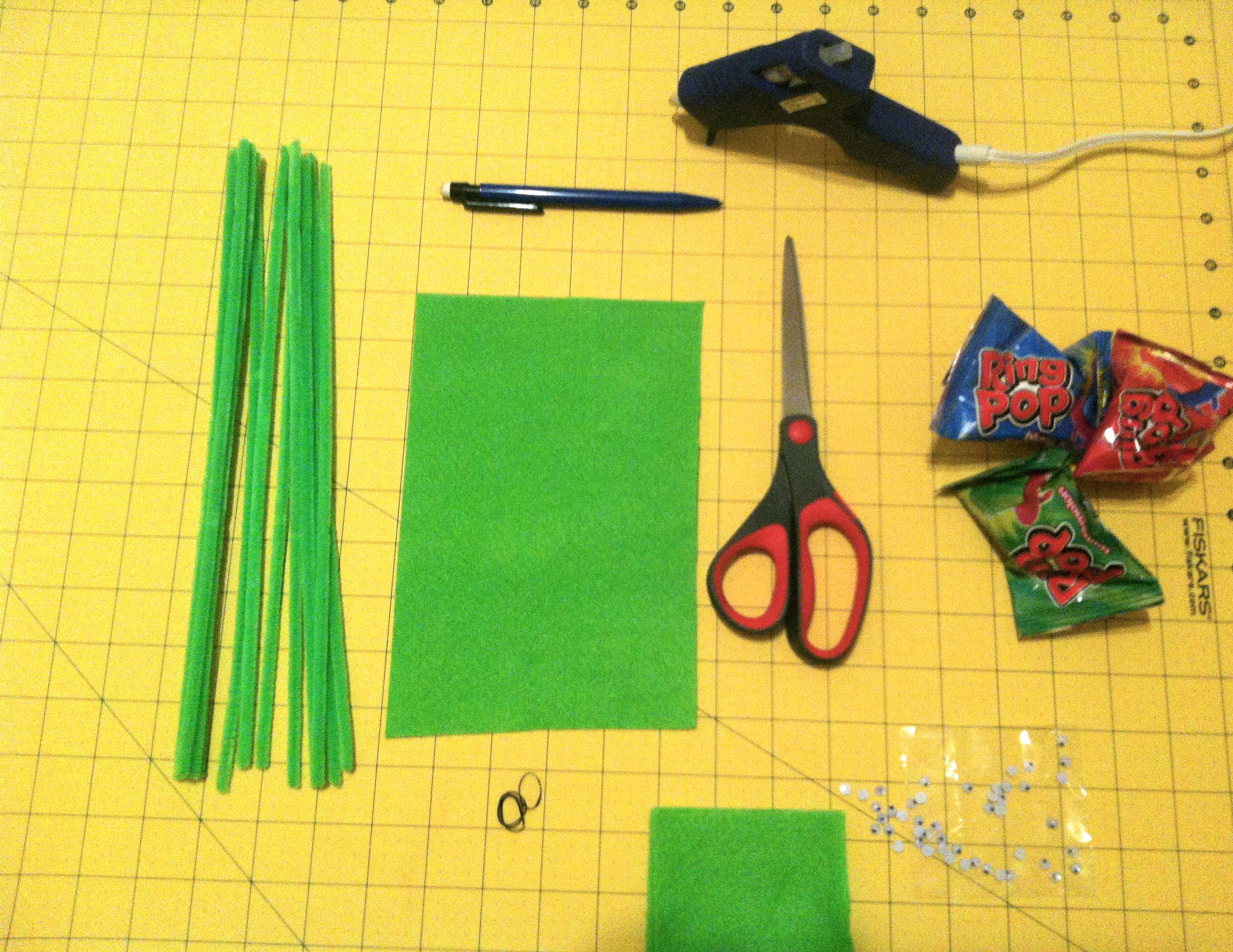 - Cut felt into small 2×2 squares and wrap the ring pop. You will need to play with the fabric to get it to lay right. {Tip} Once the rubber band is secured, trim the excess felt if needed —makes it easier to wrap the legs. But, try not to cut it too short or the felt will slip through making it harder to cover the packaging with the legs. Trust me, it get’s easier as you go! 😉