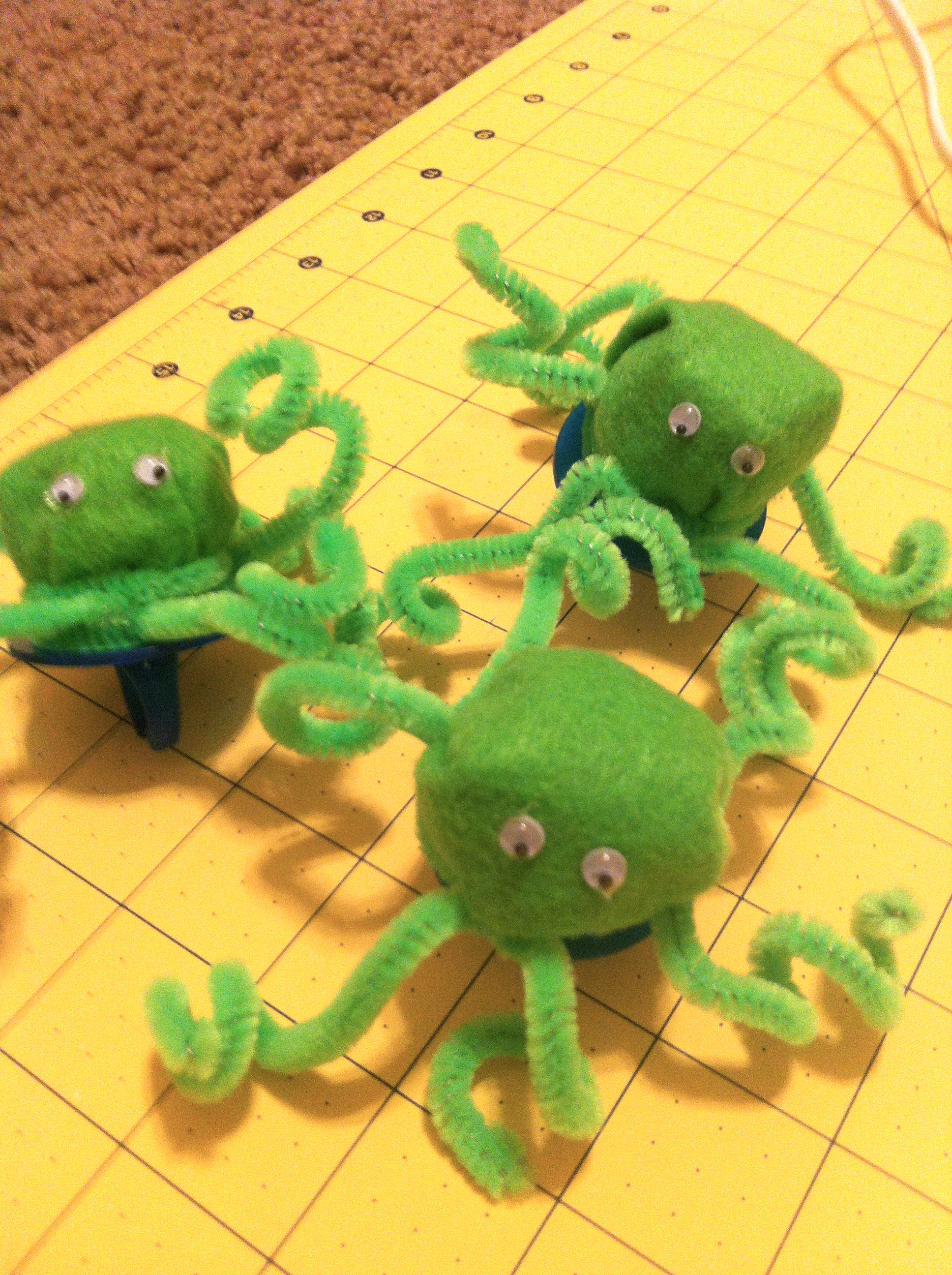 - Next, secure pipe cleaner vert tightly around the base of the pop {above black base}. Continue to do this for a total of 4 times {4 pipe cleaners=8 legs}. I ran out of space on my styrofoam, so I only used 3 pipe cleaners, for a total of 6 legs.